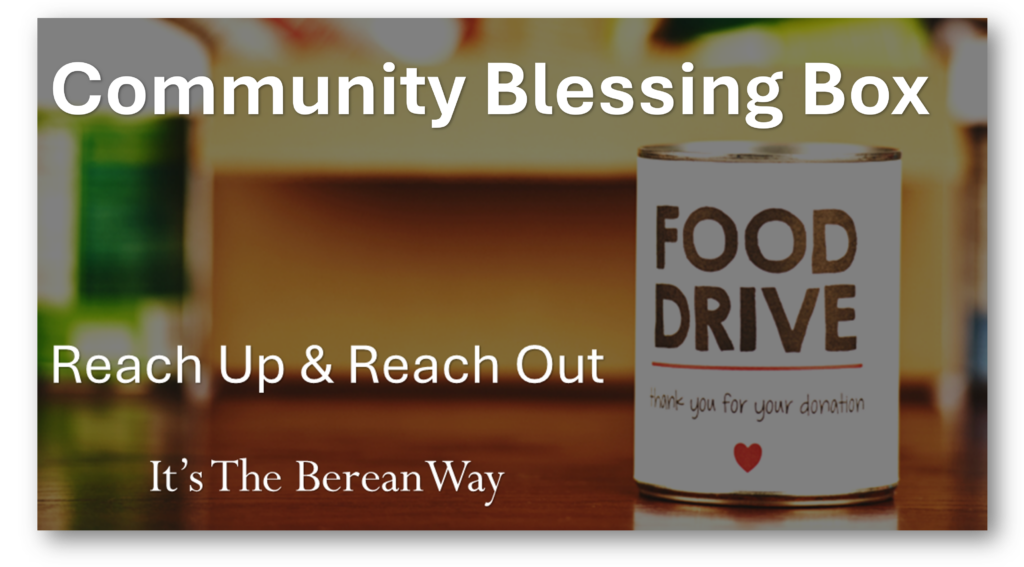 Gather non-perishables from your cabinets and at the store when you go shopping so we can help some of our local neighbors. Place them in the collection container in the Welcome Center. Thank you for being a blessing